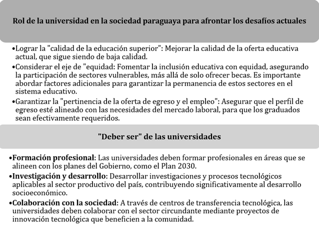 Se han recopilado opiniones de expertos en educación superior sobre el papel que las universidades de Paraguay deben desempeñar frente a los desafíos actuales. En este sentido, los expertos entrevistados destacan que la necesidad de definir el rol de las universidades, fundamentadas en la excelencia académica, priorizando la formación de profesionales en áreas alineadas con los objetivos establecidos en el Plan 2030 de las políticas del país.