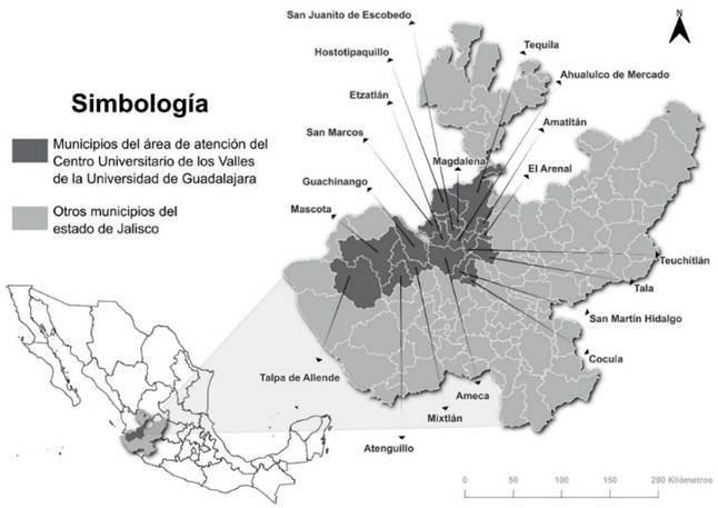 Desde sus inicios, se visualizó que el CUValles tendría un área de influencia que abarcaría municipios de tres regiones del estado de Jalisco, los cuales continúan siendo, hasta la fecha, la principal zona de atención del Centro Universitario: en la Región Valles, los municipios de Ahualulco de Mercado, Amatitán, Ameca, El Arenal, Etzatlán, Hostotipaquillo, Magdalena, San Juanito de Escobedo, San Marcos, Tala, Tequila y Teuchitlán; en la Región Sierra Occidental, los municipios de Atenguillo, Guachinango, Mascota, Mixtlán y Talpa de Allende; y en la Región Lagunas, los municipios de Cocula y San Martín Hidalgo (Ver Figura 1).[6]