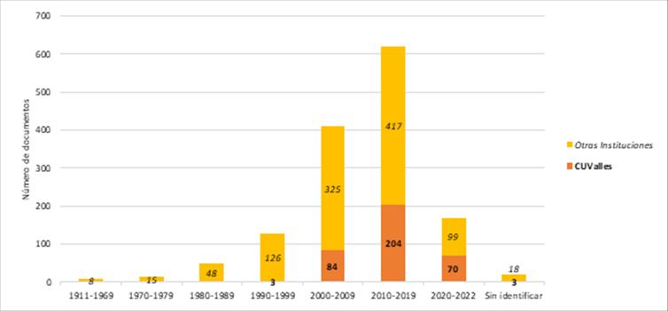 Gráfico 2. Trayectoria de producción de documentos identificados de acuerdo con la(s) institución(es) de la(s) persona(s) autora(s) de 1911 a 2022.