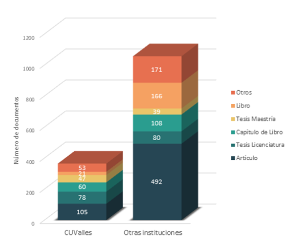 Es así como los artículos académicos son el producto de investigación que en mayor número ha reflejado aportaciones al conocimiento en este período (597), siendo de estos el 17,59% producción de CUValles. Por su parte, desde esta misma institución se han defendido 125 tesis, posicionando en el segundo lugar a las de nivel licenciatura (78 documentos que corresponden al 49.37% de este tipo) y en cuarto, a las 47 de maestría (54.65%), donde este último nivel educativo es el que refleja una mayor producción con respecto a la autoría en otras instituciones tanto de la red UdeG, nacionales e internacionales.
