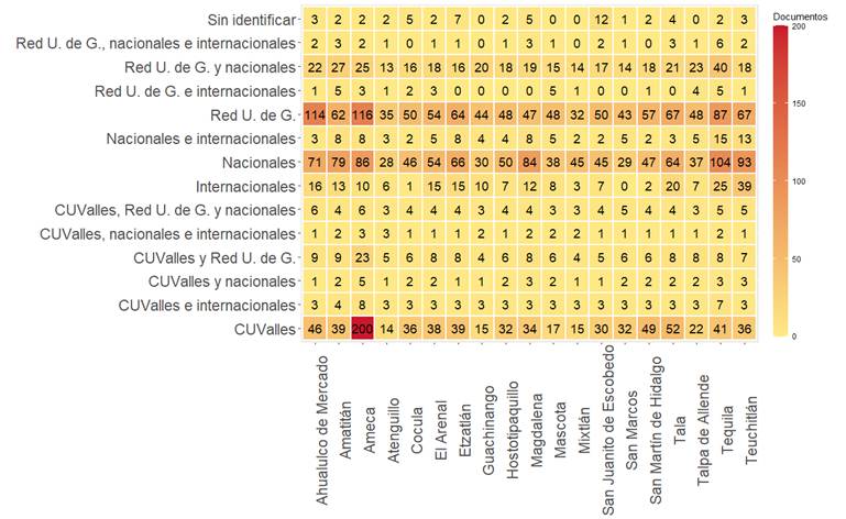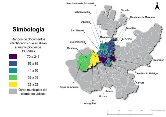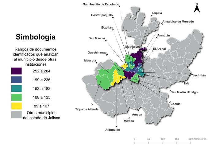 La distribución de los otros municipios de la región fue clasificada en cuatro grupos más, en función del número de documentos identificados, mismos que fueron de 28 a 66. En el grupo que alcanzó entre 56 y 66 trabajos se ubican los municipios relacionados con la industria tequilera como Tequila (66), Amatitán (60) y El Arenal (56), así como los municipios de Ahualulco de Mercado (66), San Martín de Hidalgo (65) y Etzatlán (56). El siguiente grupo se encontró en los municipios de Teuchitlán (55), Magdalena (54), Cocula (52), San Marcos (49), Hostotipaquillo (48) y San Juanito de Escobedo (44).