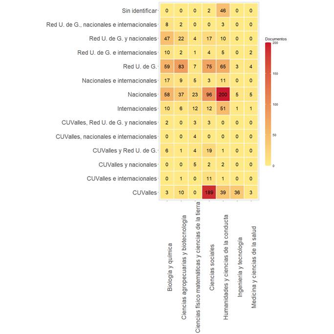 Aunado a lo anterior, la construcción de conocimiento a partir de las sinergias de colaboración entre la Red UdeG y autores nacionales reflejaron un número más alto de documentos, aportando al área de la biología y la química, mientras que el CUValles y la Red UdeG han influido en la generación de trabajo desde las ciencias sociales.