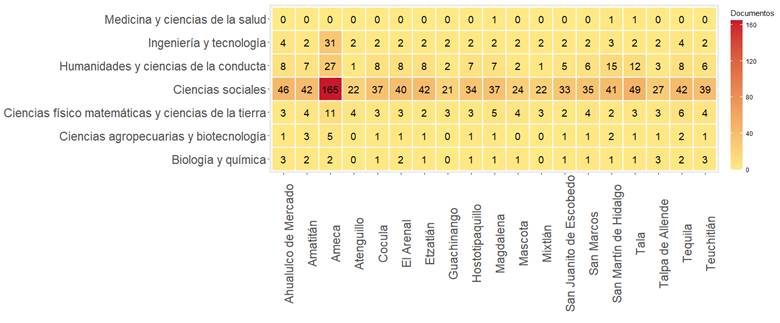 Otro aspecto relevante que muestra la Figura 6 son las aportaciones de las áreas como las humanidades y las ciencias de la conducta (43), las ingenierías y la tecnología (36) y las ciencias físico-matemáticas y ciencias de la tierra (16), las cuales se focalizan en Ameca, pero comienzan a dispersarse a lo largo de la región.