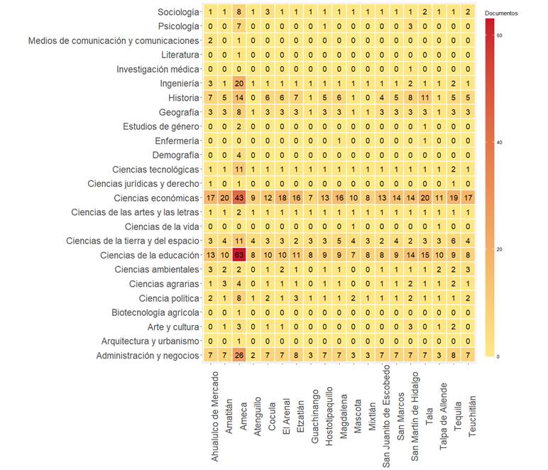Por último, desplazar el análisis de la bibliografía a un nivel más especializado del conocimiento lleva a determinar la existencia de 139 disciplinas desde las que por lo menos se ha desarrollado algún documento por parte de la comunidad de autores en sus diferentes escalas. En el caso de CUValles se identificaron trabajos que retoman 69 de ellas, de entre las cuales se destacan la didáctica, pedagogía y currículo, la administración y la gestión, otras especialidades económicas, la ingeniería de sistemas, la educación, la geología, la actividad económica o la historia regional. Todas ellas con una mirada de investigación centrada principalmente en el municipio de Ameca. Esto se visualiza en la Figura 8 y, asimismo, en esta se muestra cómo las disciplinas citadas reflejaron un interés, aunque alejado de las cifras de Ameca, para los demás municipios que integran la región de estudio.